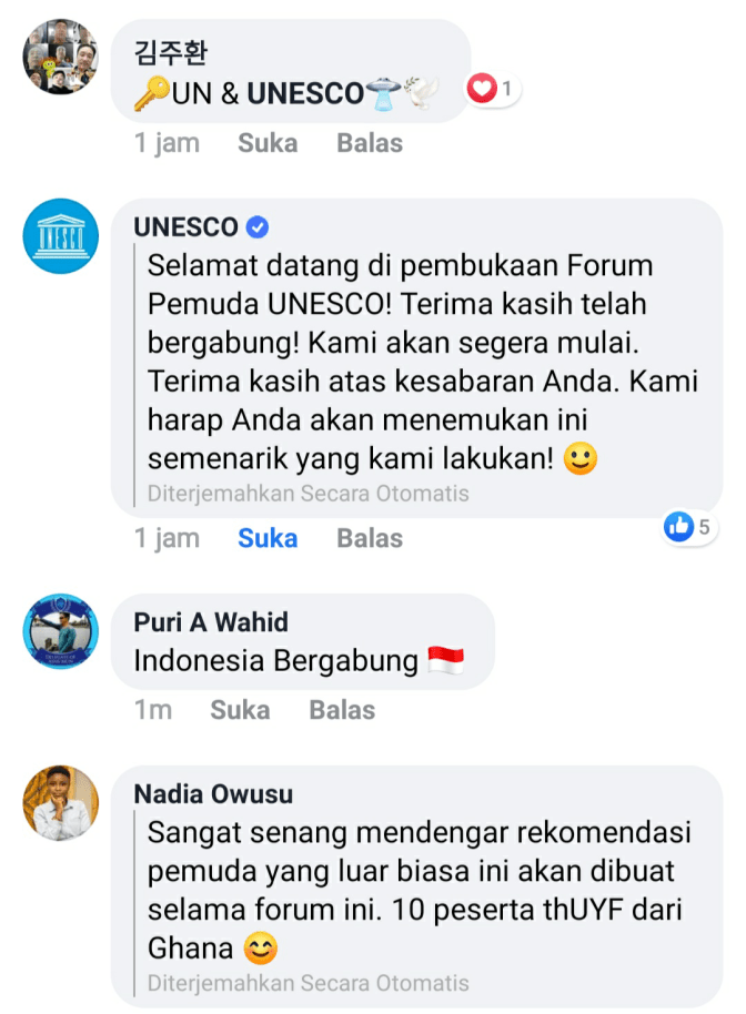 Forum Pemuda UNESCO tahun ini adalah kesempatan bagi para pemimpin muda untuk memamerkan dan mendiskusikan #Youthengageme Tidak dengan dan di luar UNESCO! Forum ini dirancang oleh para pesertanya, bersama dengan UNESCO dan akan mendorong dialog, berbagi pengetahuan dan kerja sama di antara para pembuat perubahan muda dan perwakilan pemuda, dengan UNESCO dan Negara-negara Anggotanya, dan dengan para pemangku kepentingan lainnya.